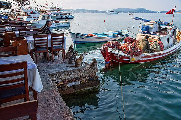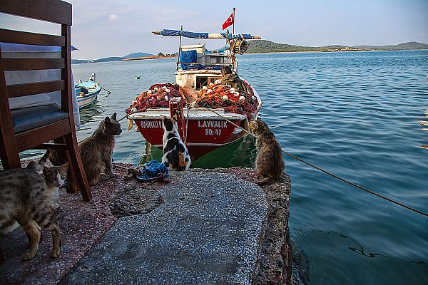 Balýkçýlarýn geliþ saatlerini, ne zaman nereye yanaþacaklarýný öylesine gözlemlemiþler ki, biri diðerinin bekleme alanýna müdahale bile etmez. Halk arasýnda þöyle bir deyiþ vardýr, boþuna dememiþler; “Ayvalýk’ýn kedisi, ölüsü, delisi” diye…