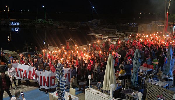 Balıkçı Barınağı’ndan başlayan, Foça Belediye Başkanı Fatih Gürbüz, Belediye Meclis üyeleri ve CHP Foça İlçe Başkanı Baran Gezmiş Yıldırım’ın da katıldığı Fener Alayı’nda, büyük Türk bayrağı ve Atatürk posteri taşındı. Marşlar söyleyen vatandaşlar, geceyi aydınlatan meşalelerle Yenifoça sokaklarını dolaşarak Belediye Meydanı’na ulaştı.