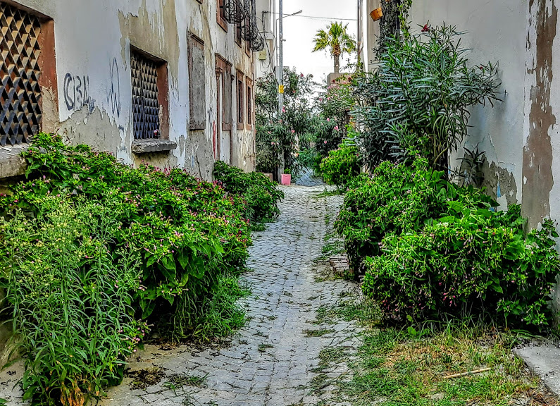 Sokak aralarında kapı önlerinde yeşili olmayan, penceresinde sardunyası bulunmayan ev yok gibi. Kırmızı, yeşil, mavi ve sarı kapılar, ağırlıklı mavi renkler kullanılmış, üç, dört basamakla girilen kapılar. Hemen her evin önünde kediler, sanki Ayvalık kedilerin başkenti gibi. Sokağında, kapısında birkaç kedi olmayan mahalle yok gibi. Her kapının önünde suluk ve yemlikler, başında toplaşan rengarenk kediler kapıların görselliğini tamamlıyorlar adeta. Bir sokaktan bir sokağa geçerken, çatısı çökmüş, kapısı ayakta zor duruyor, pencereleri sökülmüş, içinden yabani otlar, adeta kaçıyor gibi fırlamış, sarkmış bir yerlere doğru gitmek ister gibi.