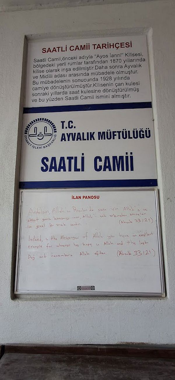 Ancak bugün gördüðümüz yapý, 1869-1870 yýllarýnda yeniden inþa edilen ikinci yapýdýr. Araþtýrmacý Dimitrios Psarros’a göre Ayvalýk’ta iz býrakan birçok kilise gibi Hagios Ioannis de, Ayvalýklý mimar Emmanuel Kounas’ýn eseridir. Çýnarlý Cami olarak bilinen Hagios Georgios, Cunda’daki Taksiyarhis Kilisesi ve bugün artýk var olmayan Hagios Nikolaos Kilisesi de onun imzasýný taþýr. Mübadelenin ardýndan Hagios Ioannis Kilisesi camiye çevrilir. Çan kulesindeki saat nedeniyle halk arasýnda “Saatli Cami” adýyla anýlmaya baþlanýr. Belki de bu saat, yalnýzca zamaný deðil, belleði de ölçmeye devam eder. Yüzyýlýn sonlarýna gelindiðinde Ayvalýk’taki kilise mimarisi önemli bir dönüþüm geçirir. Bazilikal plan terk edilir; yerini neoklasik cephe düzeniyle birlikte haç planlý yapýlar alýr. Hagios Ioannis ve Hagios Georgios kiliseleri, bu mimari anlayýþýn ilçe merkezindeki en belirgin örnekleridir.