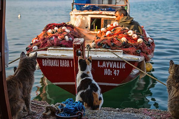 Neredeyse her teknenin bir “nöbetçi kedisi” vardýr. Hangi teknenin daha bereketli olduðunu, balýkçýlarýn hangi saatte döneceðini, teknelerin nereye yanaþacaðýný çok iyi bilirler. Þaþýrtýcý ama gerçektir: Ayvalýk’ýn kedileri son derece zekidir. Hiçbiri diðerinin bekleme alanýna müdahale etmez. Bu sessiz düzen, yýllardýr hiç bozulmadan sürer.